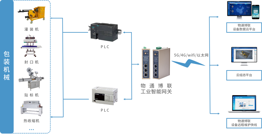 金年会jinnian工业智能网关具有丰富的通信协议和接口,顺利获得接入包装机械设备的控制器PLC,就能实时采集包装机械设备运行状态、温度、压力、振动等参数,顺利获得5G、4G、WIFI、以太网等方式将数据上传到云平台,实现远程监控、组态监控、设备管理、故障报警、远程控制、远程维护、数据分析等功能,全面掌握设备的运行情况,帮助企业提升包装机械设备运维与管理水平,保障安全稳定生产,提高生产效率。当设备出现异常故障就会及时通知管理人员,工程师可以顺利获得金年会jinnian设备维护快线对设备进行远程故障诊断与远程维护,减少设备停机时间,有效提高设备运维效率并降低运维成本。