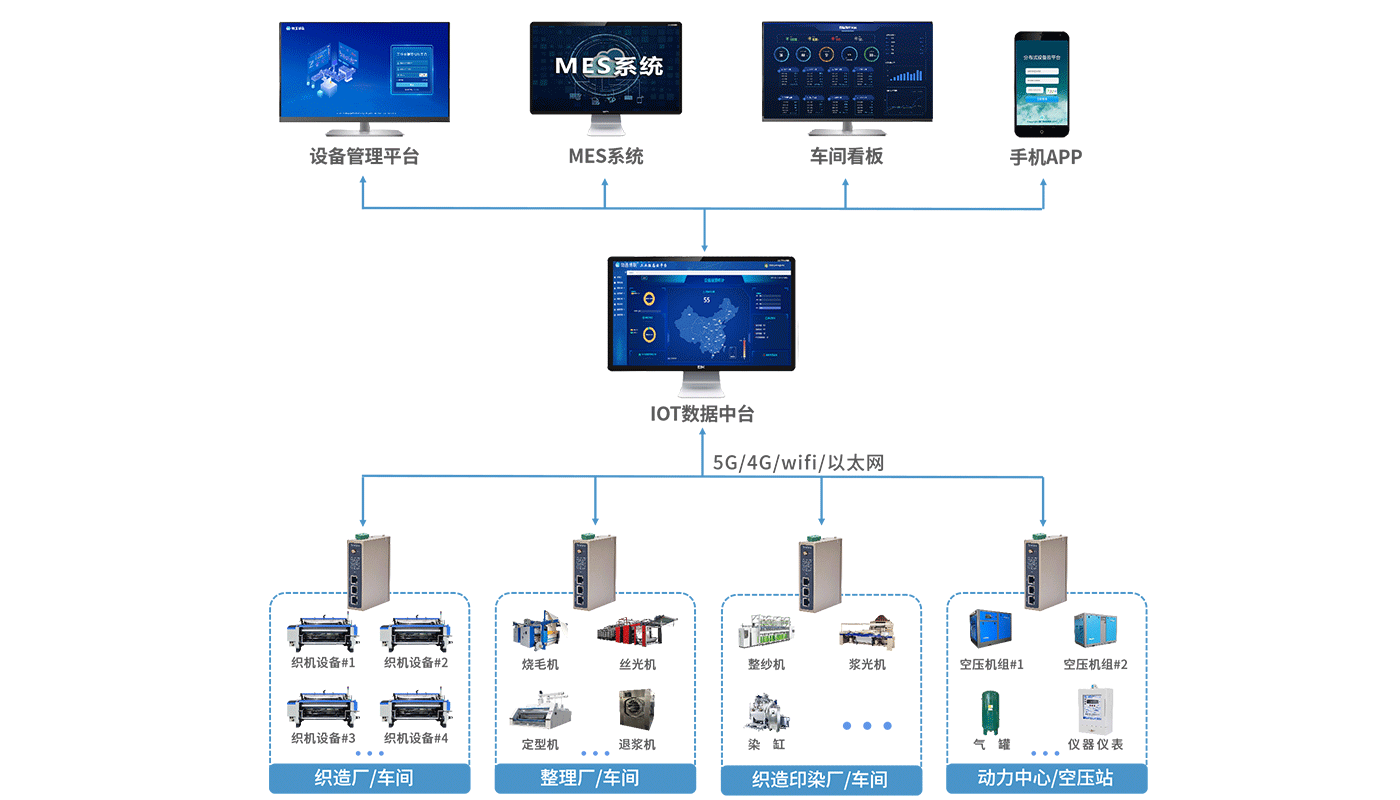 金年会jinnian推出了基于PLC物联网技术的纺织工厂设备监控运维系统解决方案。该系统顺利获得工业智能网关与纺织机械的控制器PLC相连接,进行数据采集并以5G/4G、wifi、以太网等方式与金年会jinnian设备运维管理平台实时通信,为设备管理、运维管理等方面给予高效便捷的管理手段。 网关也能将数据转发到MES系统,结合数据大屏分析各种设备状态与生产参数,从而帮助制定科学合理的经营策略,助力纺织工厂的数字化转型。