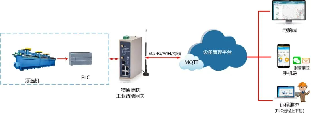 行业背景 在矿产资源开发领域,浮选工艺作为核心环节,对于提升矿石品位、提高资源利用率起着至关重要的作用。随着工业自动化进程的不断推进,浮选机逐渐引入了可编程逻辑控制器(PLC),实现了对设备运行的精准控制,如对浮选药剂添加量、搅拌速度、充气量等关键参数的自动化调节,大大提升了浮选作业的稳定性和生产效率。 然而,传统的浮选机PLC控制系统相对独立,设备产生的大量运行数据被困在本地,形成了一个个“数据孤岛”,难以实现对生产过程的全面监控与深度分析,无法充分发挥数据的价值,难以满足企业日益增长的精细化管理和智能化决策需求。 痛点分析 01 数据采集困难:浮选车间的浮选机,新旧设备混用现象普遍,PLC通信协议相互独立封闭,导致数据通信困难,管理系统难以集成。因此要求实现PLC数据采集与协议转换。 02 设备监控缺失:传统模式下,对浮选机的运行状态监控依赖人工巡检,效率低、实时性差,难以及时发现设备潜在故障隐患。因此要求实现设备远程监控与故障告警。 03 数据分析受限:由于数据分散且缺乏系统性的管理机制,导致大量生产数据得不到分析与利用,限制了企业生产效率与经济效益的提升。因此要求实现数据可视化管理与分析。
